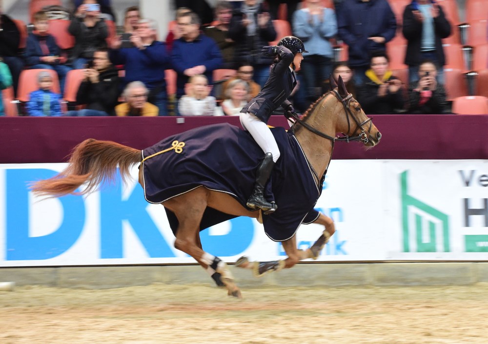 Christin Wascher aus Redefin jumpte mit ihrem Quincy auf den zweiten Rang nach einem schnellen Stechen und war damit vollkommen zufrieden. Die Springreiterin aus Mecklenburg-Vorpommern erlebt ihr letztes Jahr in der U25-Altersklasse. Brandenburgs internationales Hallenturnier ist für sie immer wieder ein Ziel und zwar eines, das sie gern ansteuert. “Ich glaube wir werden hier genauso gefeiert wie die Brandenburger Reiter”, lacht die Reiterin, die ihrem Quincy am Montag einen entspanneten Tag mit Weidegang gönnen wird.