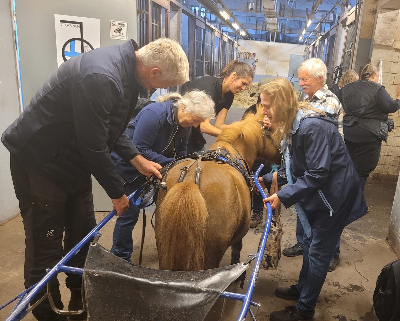 Pünktlich um 18.00 Uhr trafen die interessierten PM-Mitglieder am Treffpunkt auf den ersten Traber und seine Trainerin: Shetlandpony „Onni“ und Nina Oikarinen. Erstaunt erfuhren die PMs, dass Onni seine kurzen Beine sehr erfolgreich bei „Kinderrennen“ auf der Trabrennbahn fliegen lässt. Wie sich das in der Praxis aus seinem Sulky aus anfühlt, konnten die Teilnehmer des Seminares später selbst erleben.