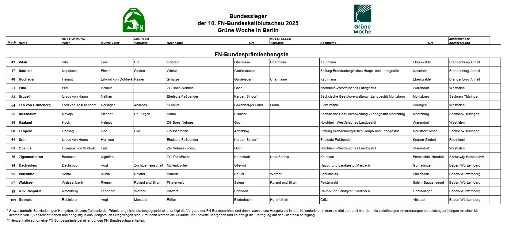 Erstmals nach 2017 war die Grüne Woche in Berlin wieder Schauplatz der FN-Bundeskaltblutschau. Bei ihrer zehnten Auflage kämpften insgesamt 79 Hengste und Stuten um FN-Bundesprämien und Titel. Insgesamt wurden vier Stuten und zwei Hengste der Rassen Rheinisch-Deutsches Kaltblut, Schleswiger Kaltblut und Schwarzwälder Kaltblut mit dem Titel Bundessieger ausgezeichnet.