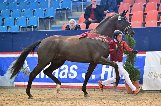 Mit der abschließenden Auktion der gekörten und nicht gekörten Hengste endete das Schaufenster der Besten 2026 in Neustadt (Dosse). Noch einmal präsentierten sich 29 Auktionskandidaten in der sehr gut besuchten Graf von Lindenau-Halle. Bei 80.000 Euro fiel der Hammer von Auktionator Hendrik Schulze-Rückamp gleich für den ersten Hengst, dem Dressursiegerhengst von Bloomingdale - Millennium/T., der damit auch zur Preisspitze des Abends avancierte. Den lackschwarzen Nobelmann sicherte sich die Sächsische Gestütsverwaltung Moritzburg. Auch der teuerste Springhengst darf eine Beschälerbox in einem Landgestüt beziehen. Den Reservesieger von Toys - Ramirado ersteigerte der Neustädter Landstallmeister Dr. Henning Frevert für 61.000 Euro. Mit der dem Diamond First - Millennium/T.-Sohn sicherte sich das Brandenburgische Haupt- und Landgestüt einen weiteren hoch interessanten Prämienhengst aus dem Dressurlot. Die Hengststation Maas J. Hell ersteigerte einen ebenfalls gekörten Vivanero His - Moment/T.-Sohn. Der Gesamtumsatz bei den 25 vorgestellten DSP-Hengsten betrug in diesem Jahr 636.750 Euro. Der Durchschnitt lag bei den gekörten Hengsten bei 31.206 Euro. Für einen nicht gekörten Hengst legten die Bieter im Schnitt 13.281 Euro an. Zum Auktionslot gehörten auch in diesem Jahr erneut vier Reitpony- & Kl. Dt. Reitpferd-Hengste. Mit 20.000 Euro konnte hier der Siegerhengst von Gold Garant - Foundation den Höchstpreis erzielen.