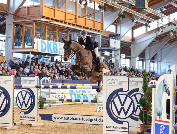 Der Sonntag in der Graf von Lindenau-Halle geriet abwechslungsreich und spannend: Drei internationale Youngster-Finals zum Auftakt, die Einzelwertung der Junior Future Tour der DKB anschließend, dann eine kurzweilige Präsentation von Hengsten des Haupt- und Landgestüts Neustadt-Dosse, inklusive der beiden am Vorabend in der Auktion erworbenen Neuzugänge und schließlich als Höhepunkt der Große Preis. Den steuerten 43 Paare an, aber nur sechs erreichten das Stechen.